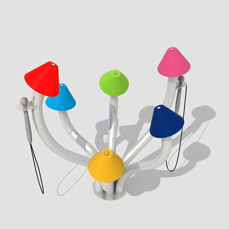 Un conjunto de seis "sombreros" cónicos con recubrimiento en polvo y colores vibrantes, con varillas corrugadas de acero inoxidable en diferentes alturas y ángulos, lo que lo convierte en un elemento llamativo que pronto se convertirá en el más popular.